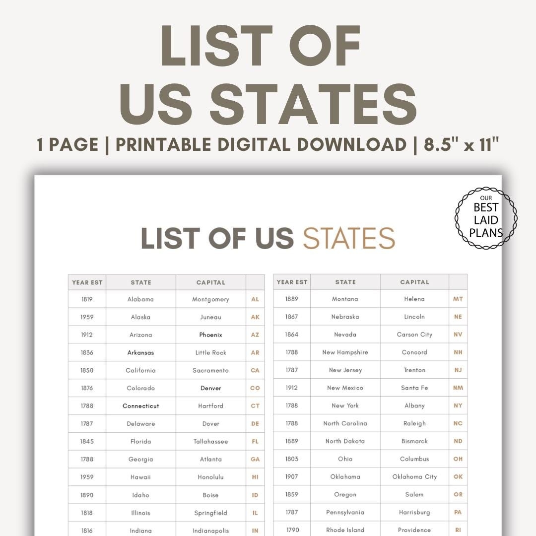 List Of The 50 States List Of States Printable Alphabetical List Of States US States And Capitals List Of States Of USA In Order Printable Etsy