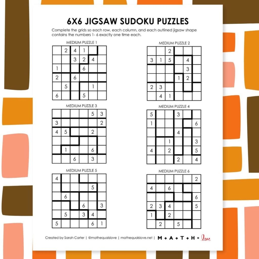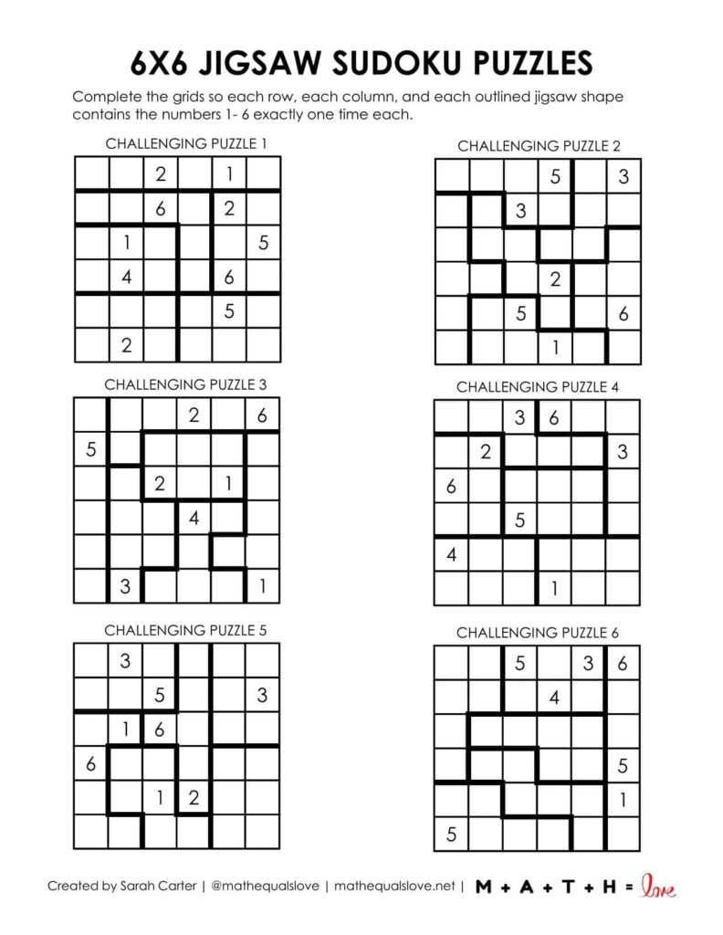 6×6 Jigsaw Sudoku Puzzles Free Printable PDF