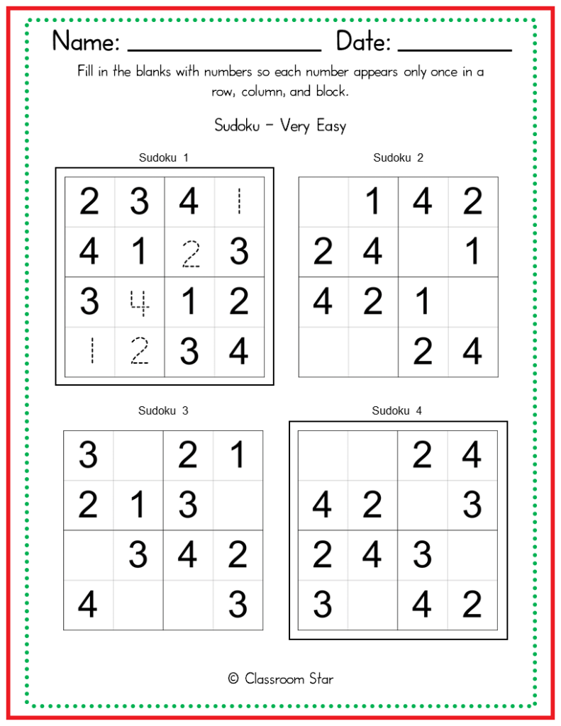 Sudoku 4×4 Very Easy Puzzles Classroom Star Worksheets